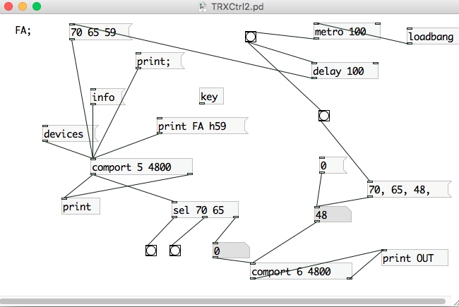 FT-DX5000でもFT-DX5000でもCATに「FA;」と送ると、VFO-Aの周波数を返してきます。PureDataの[comport]のinletに「FA;」を10進にした「70 65 59」というメッセージを送ると左outletから受信データ(例えば14.025.000MHzならば「FA14025000;」を10進にしたデータが、1バイトずつ出てきます。