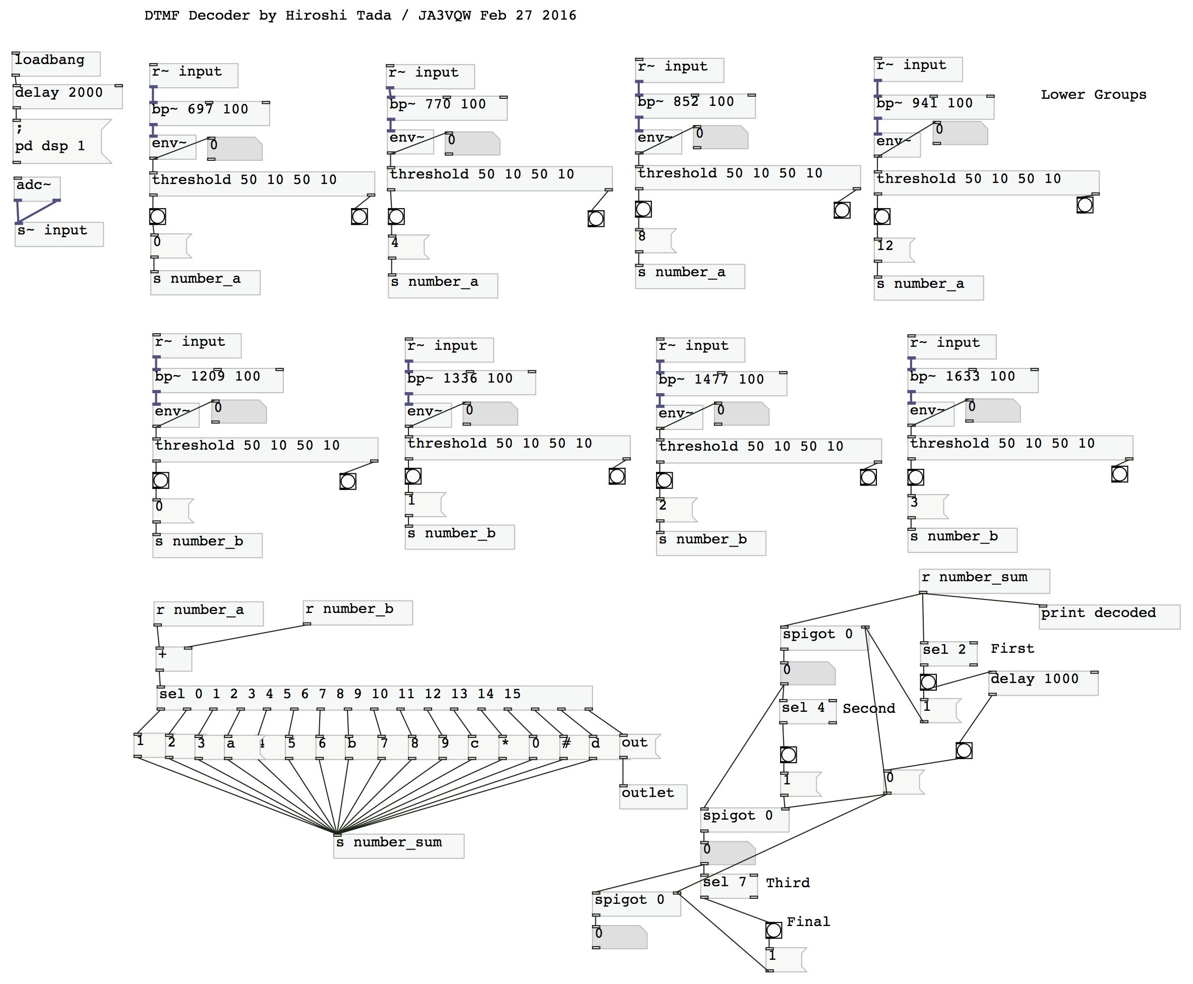 ネットの情報やPureData関係の書物に掲載されているものでも、DTMFのデコードには、FFT=高速フーリエ変換を使うのが王道のようです。